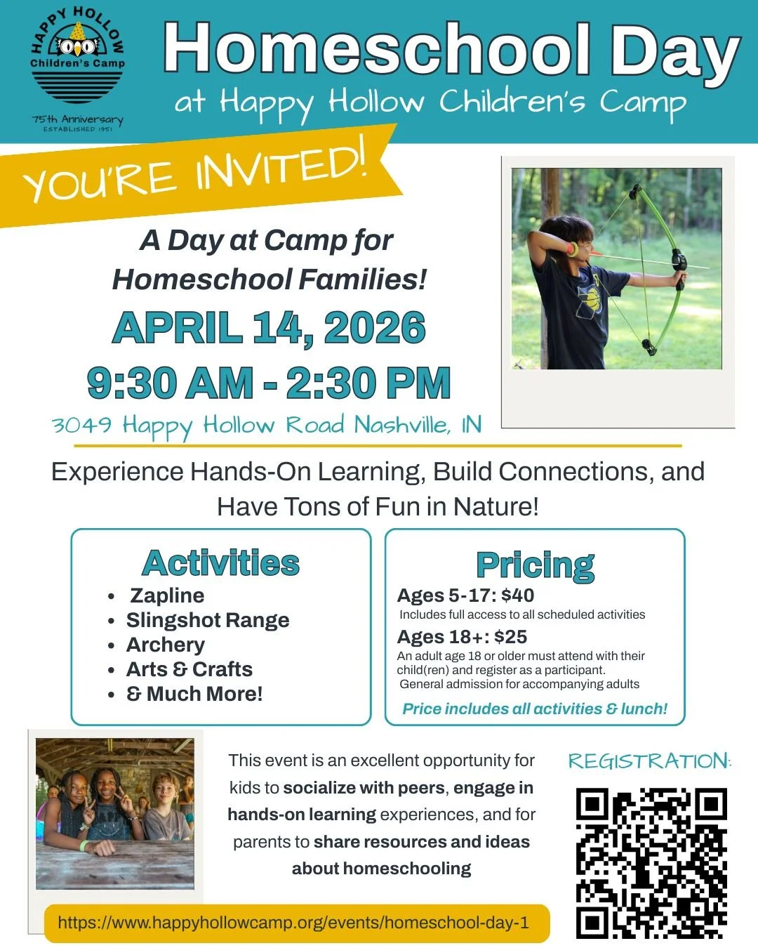 Happy Hollow is inviting you to be a part of our Campfire Circle and support the transformational and impactful work of Camp. No matter the level of partnership you choose, you will be giving the gift of adventure camp to very deserving children from under-resourced households. With your support Happy Hollow can provide youth with transportation to and from camp, 3 homemade meals and day and a snack, around the clock supervision and health and mental health care, quality programming that grows leadership and social emotional skills and endless adventure opportunities to explore!